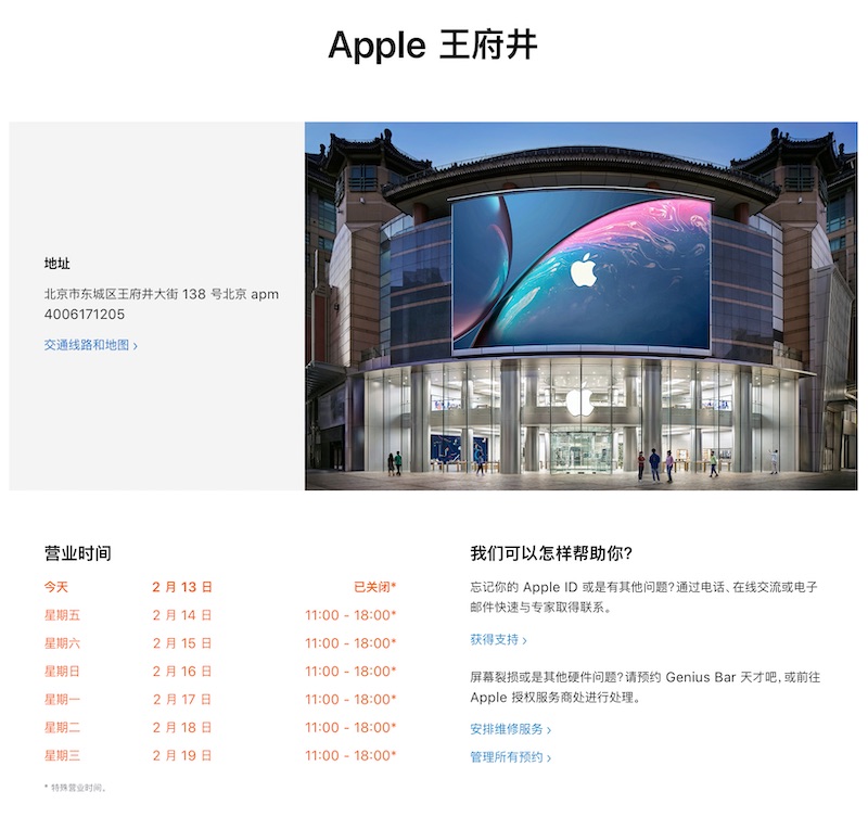 了我国区一切办公室和 Apple Store 零售店,原定从头开放时刻为 2 月 9 日,但零售店到现在都还没有从头开业运营。动点科技查询苹果官网后发现,坐落北京的一切 5 家 Apple 零售店,将于 2 月 14 日本周五康复经营,开放时刻为每日 11 点至 18 点。这要比素日正常经营时刻短,苹果也在网站上注明此为“特别经营时刻”。一起,苹果在